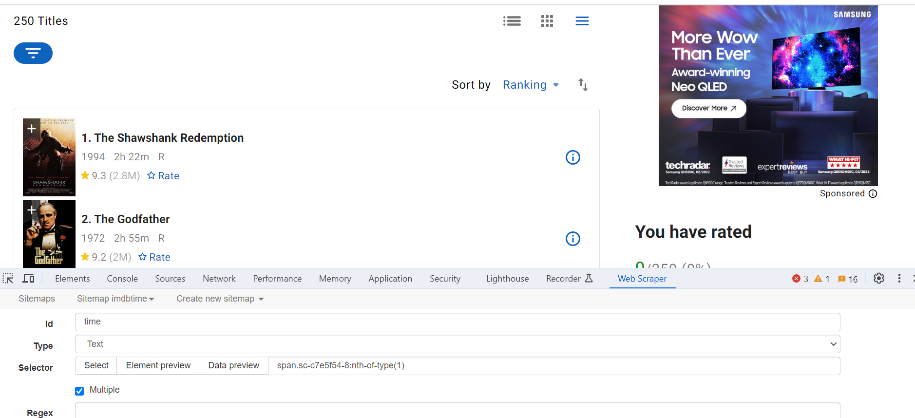Today, I want to use the web scraper to grab 'IMDb Top 250 Movies'.