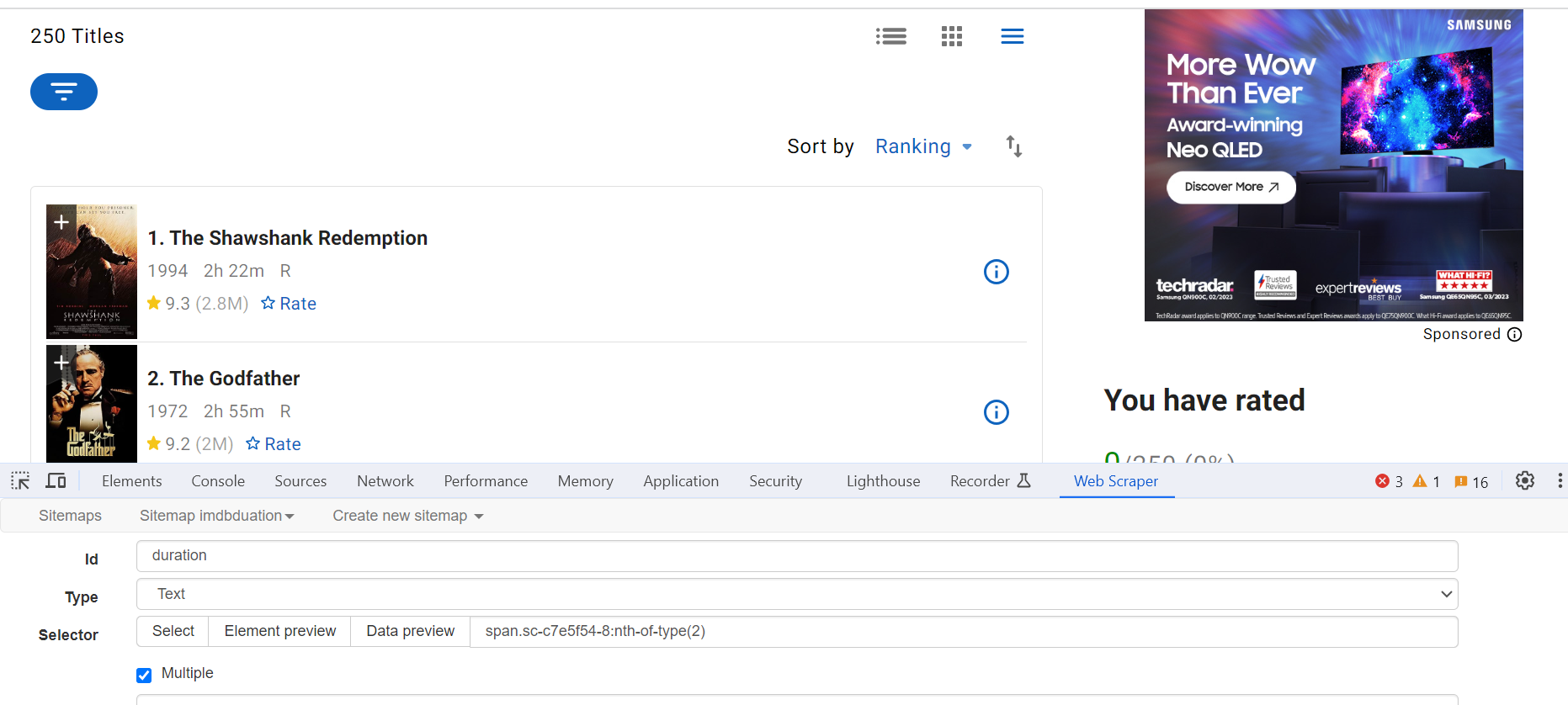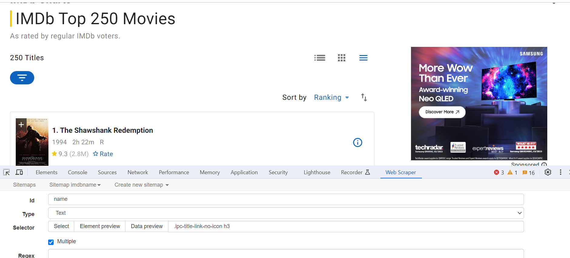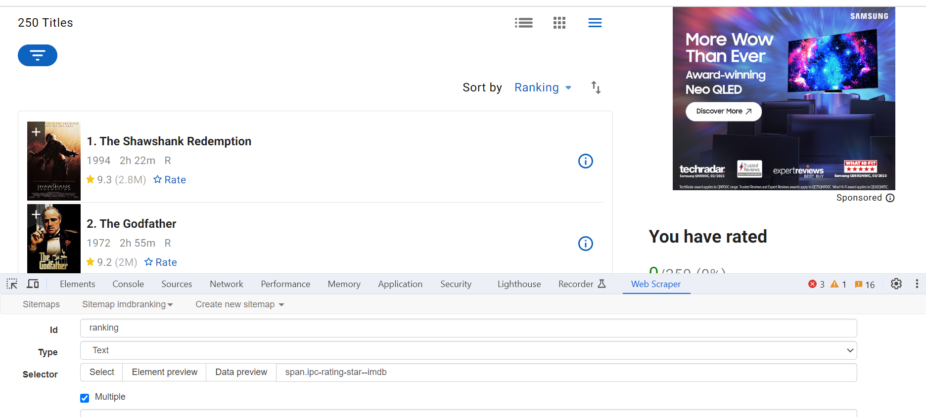 Today, I want to use the web scraper to grab 'IMDb Top 250 Movies'.